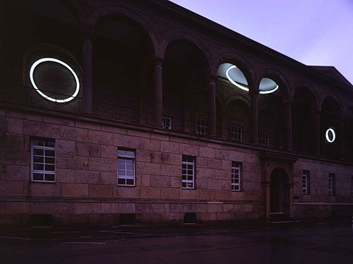 2 Lichtkreise und eine Lichtellipse aus mattem Plexiglas, Sonderanfertigung, großer Kreis: Ø 300 cm, kleiner Kreis: Ø 150 cm, Ellipse: Ø 700 cm