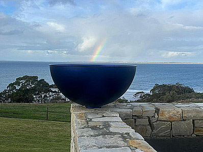 1987 habe ich auf dem Furkapass in den Schweizer Alpen auf einem Trockenbrunnen eine Schale aus blau eloxiertem Aluminium platziert und diese Arbeit mit einem poetischen Lehrsatz des Zen-Meisters Sengai als Iss dies und trink eine Tasse Tee betitelt. Seit dem sind 30 Jahre vergangen. Damals war ich noch »nicht angekommen«. Doch es war, als sei ein Leitgedanke aus meinem Herzen aufgestiegen und habe sich ganz intuitiv realisiert. Auch ohne ein Ankommen geschahen diese Entwürfe. Heute bin ich »angekommen, heimgekehrt, ohne etwas anderes«. Mein Charakter hat mich diesen Entwurf erkennen lassen. Das Samenurkorn des Bewusstseins (ālaya-vijñāna), die Wurzel der fünf Sinne (manas-Vijñāna).